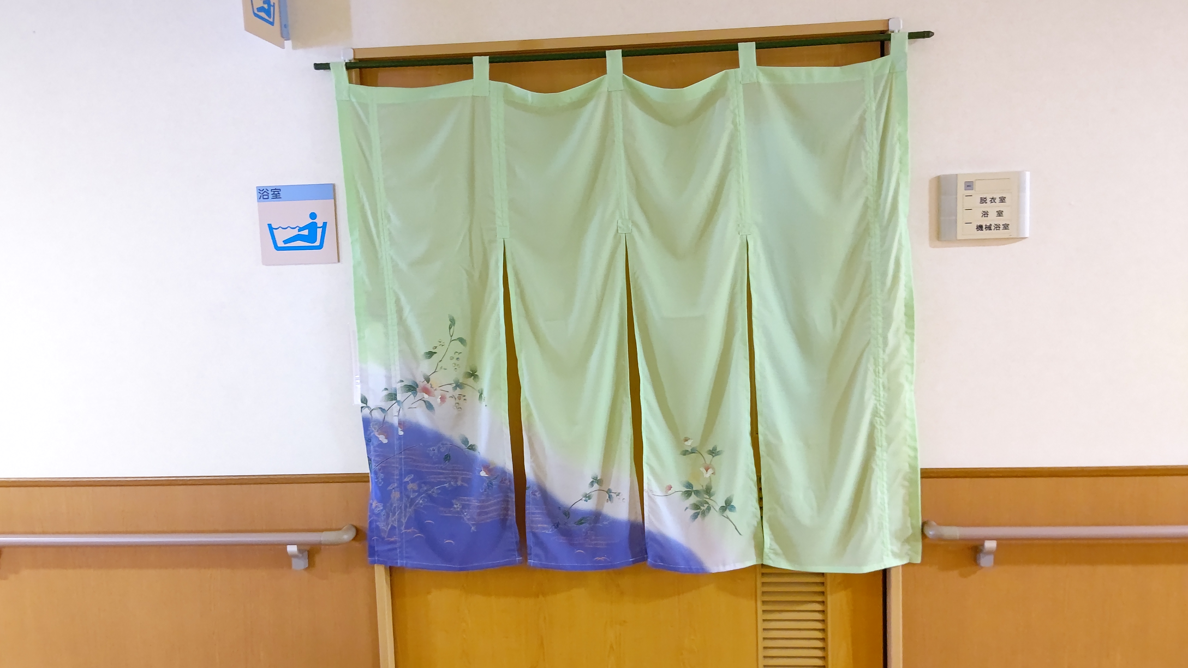 こちらののれんは、介護士さんが着物を切って作った手作りです。