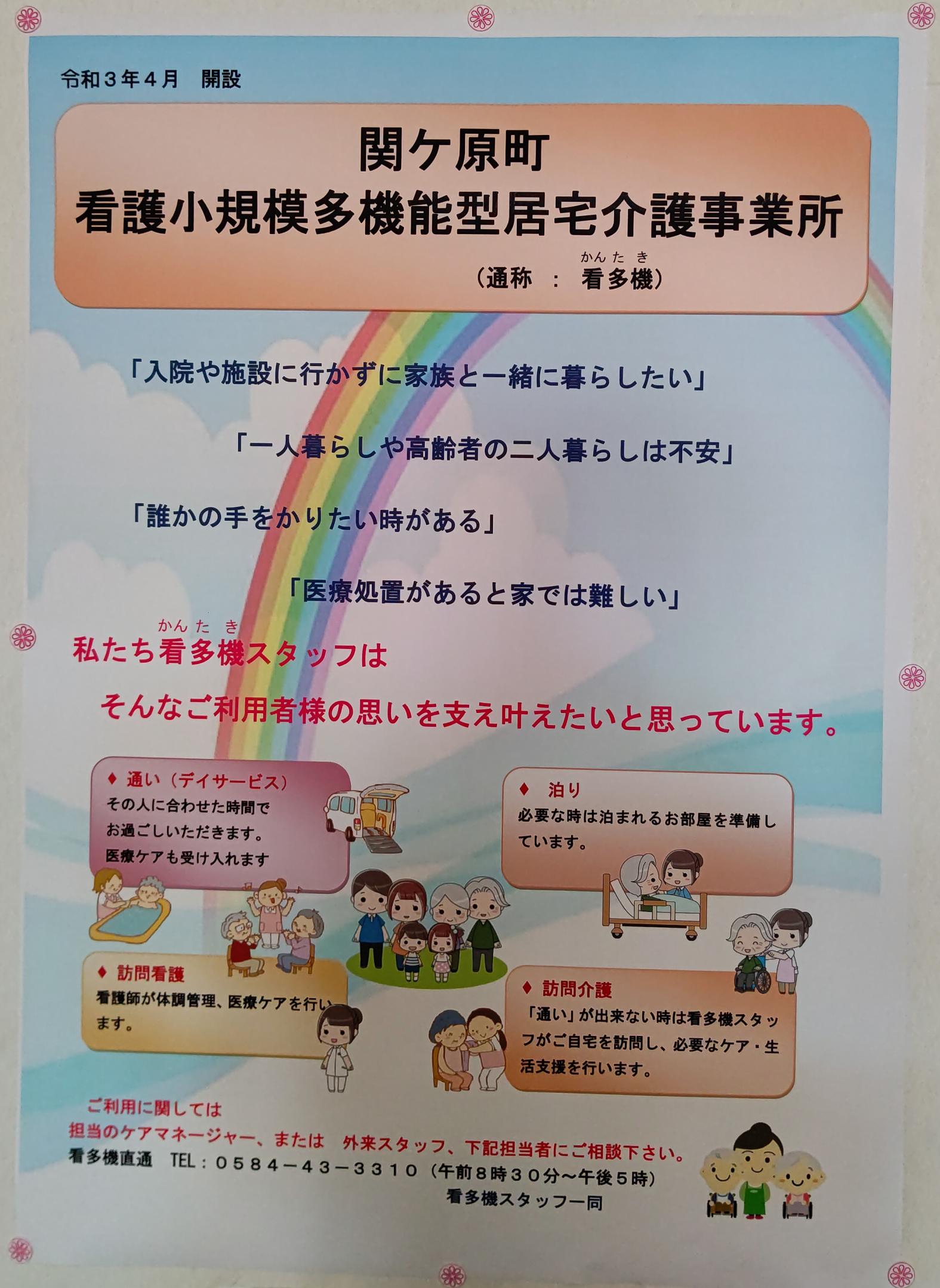 こんにちは 看多機看護師の松田です。 看多機のポスターが完成いたしました。 こちらのポスターは、関ヶ原診療所の正面玄関入ってすぐの場所と、外来待合室に貼りだされています。 持ち帰り用の冊子もございますので、ご自由にお持ち帰りいただき看多機とはどういう事業所なのか知っていただければ幸いです。 ![]() ![]() 看多機についてのご質問は、担当ケアマネージャー、またはかかりつけの医師、看護師、メール、電話にてお問い合わせください。 メールでのお問い合わせはこちら お電話でのおといあわせはこちら